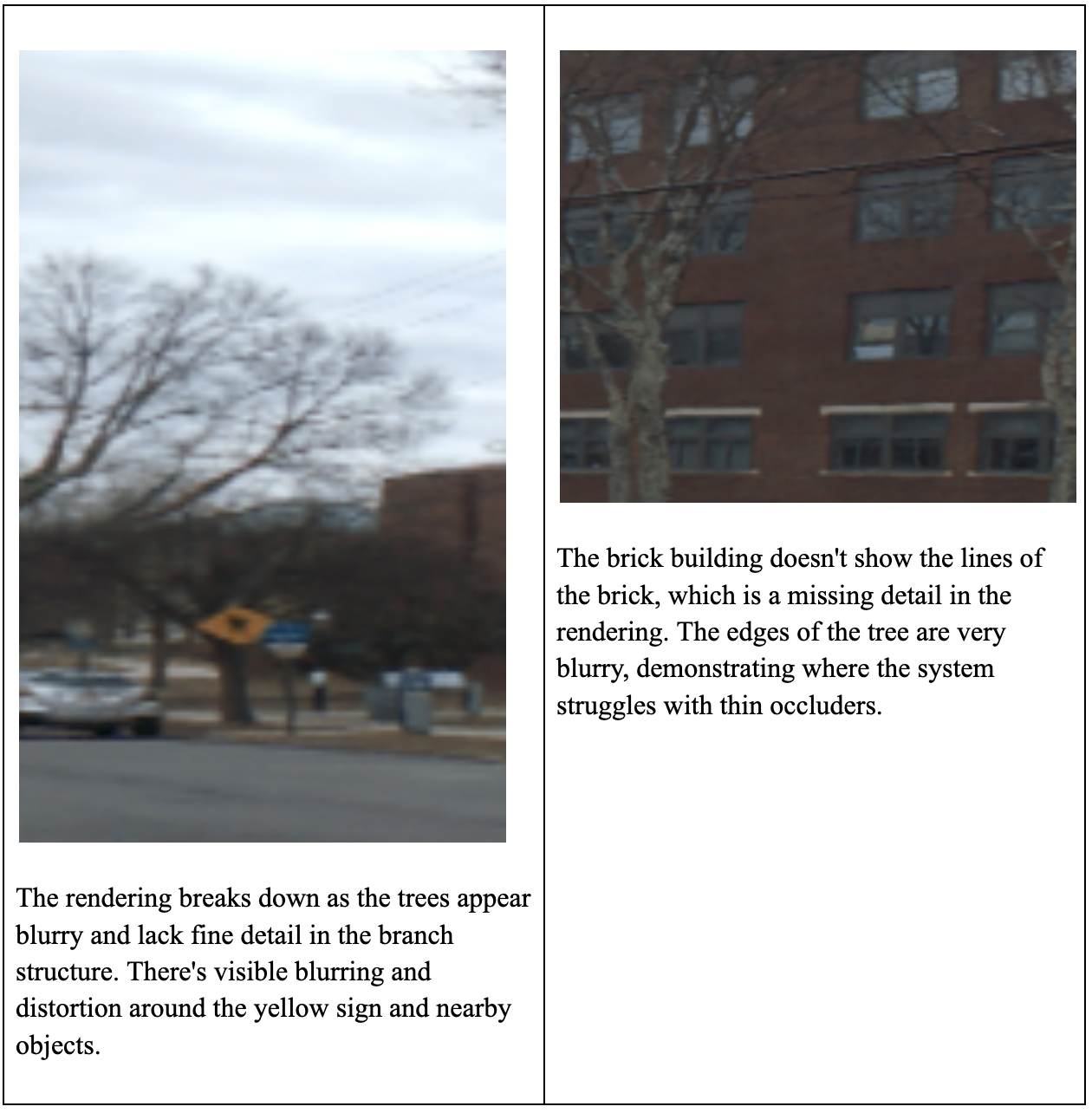 - Fast moving objects - Dynamic occluders like buses or pedestrians are only observed in a few frames; the network struggles to disambiguate them from static background. In the left panel below, the yellow road sign and nearby objects are distorted, and the tree lacks fine detail.