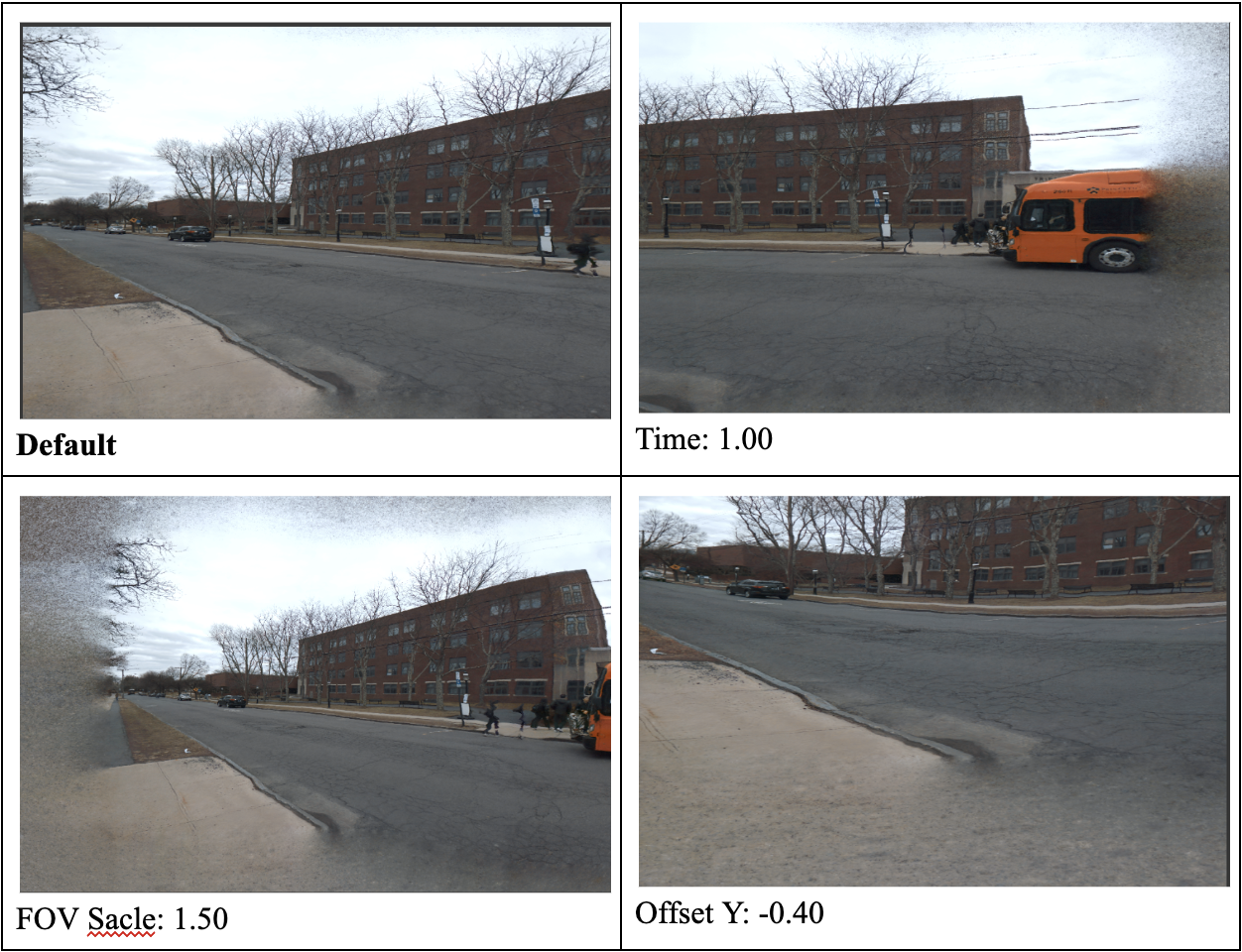 - Vertical offset -0.40 (bottom right) moves the virtual camera upward relative to the capture trajectory. The sphere geometry ensures consistent projection even when the virtual camera deviates from the original path, but too large an offset results in missing geometry because parts of the scene were never observed.