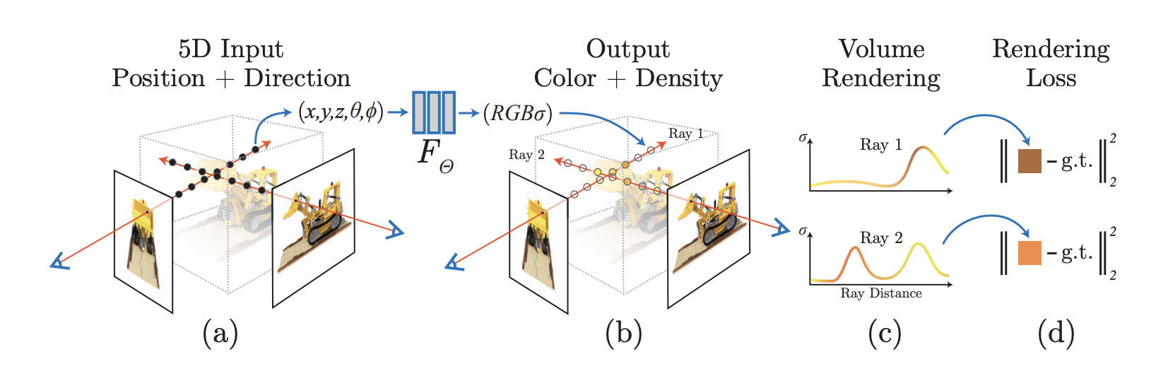 Neural Radiance Fields (NeRF) represent a scene as a continuous volumetric field and use a neural network to map a 3D point and a viewing direction to a colour and opacity. The method implicitly parameterises a scene with a multi-layer perceptron (MLP) that takes a 3D position x and a view direction d and outputs a colour vector c and a density value σ. The colour integrates emitted radiance along the ray and the density acts like a probability of encountering matter along the ray. Rendering novel views becomes an instance of numerical quadrature: the continuous rendering integral
