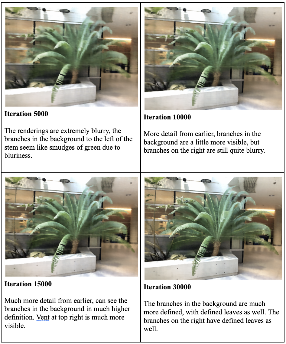 During training we observed that the quality of the renderings improves steadily with more iterations. Early images capture coarse structure but are dominated by blurriness and artefacts. As the network learns, both geometry (depth and shape) and radiance (colour and shading) become more accurate. After around 25-30k iterations the model produces sharp results with realistic shadows and fine textures. Further improvements could come from hierarchical sampling—using separate coarse and fine networks to allocate more samples near high-density regions—or from recent advances such as Instant NeRF for faster training.