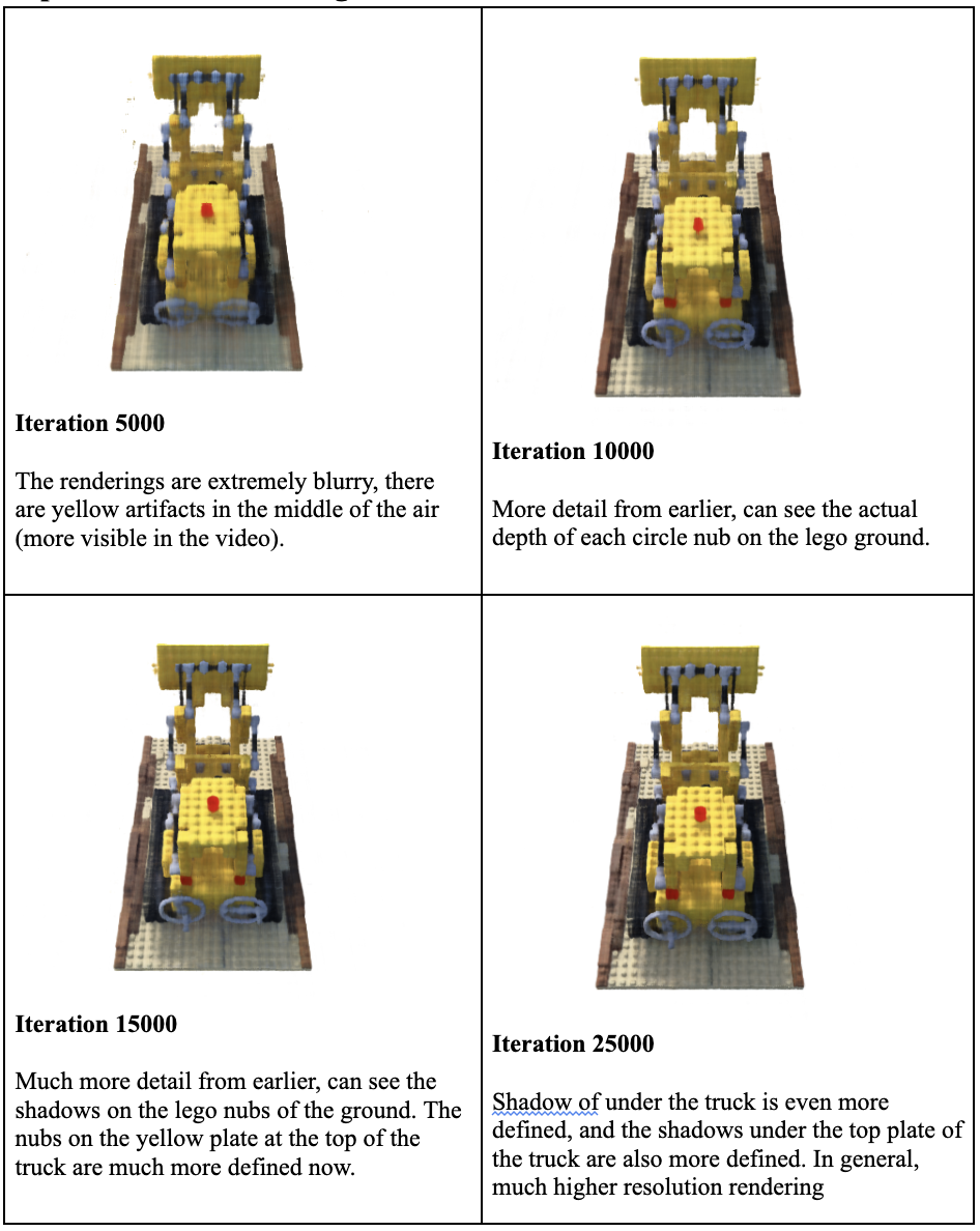 The LEGO truck scene shows four snapshots at 5,000, 10,000, 15,000 and 25,000 training iterations. Early on the model only captures coarse shapes—renderings are extremely blurry and yellow artefacts float in mid-air. By 10,000 iterations the network has learned enough structure to reveal the circular nubs on the ground, though edges are still soft. At 15,000 iterations the shadows cast by the LEGO nubs on the ground and the nubs on the top plate become more pronounced. By 25,000 iterations the shadows beneath the truck and under its roof are well resolved and the reconstruction appears crisp and high resolution.
